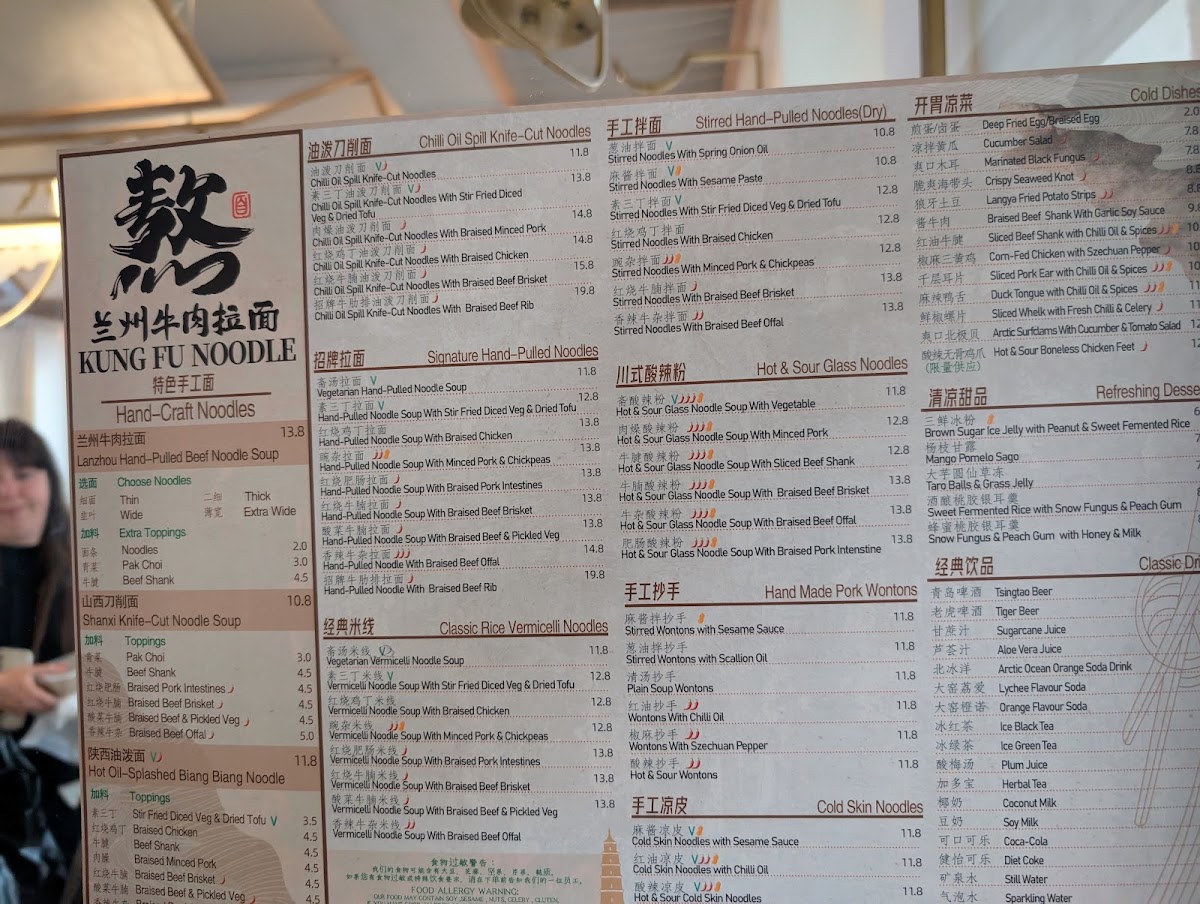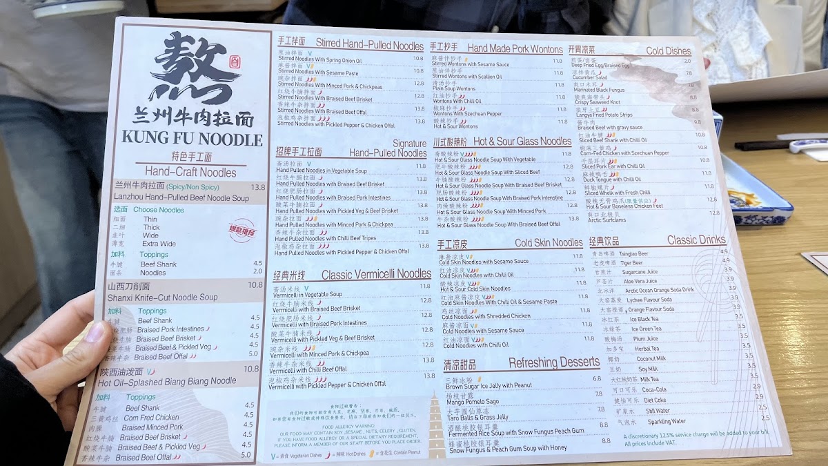 Kung Fu Noodle, located in the heart of London, specializes in authentic hand-pulled noodles that will transport you straight to China. With a menu rich in flavors, highlights include their signature noodle soup and savory chili oil noodles. Vegetarian options cater to diverse palates. The atmosphere is vibrant, featuring communal seating that fosters a fast-casual dining experience — perfect for solo lunchers or groups alike. Customers rave about the generously sized portions, quick service, and the delicious wonton soup that keeps them coming back. If you're after hearty, flavorful Asian cuisine, Kung Fu Noodle is a must-visit destination.